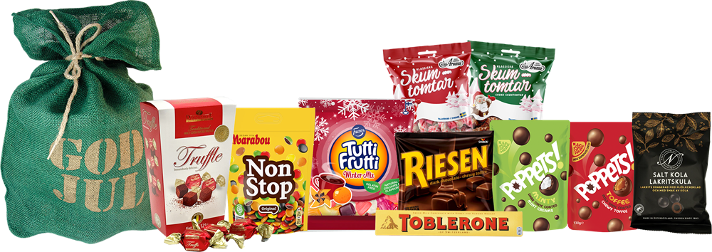Grön jutesäck fylld med godis av enbart kända varumärken.