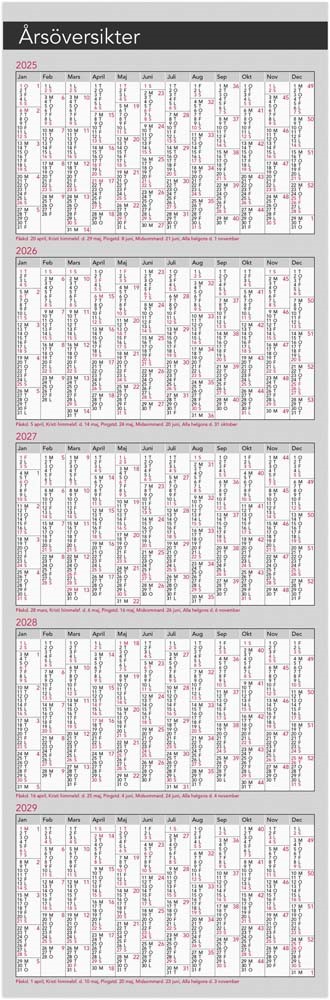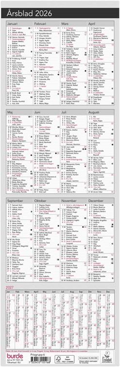 Format: 120x366 mm. Layout: År/blad. Kalendarium: 2026-01-01 - 2026-12-31. Innehåll: Kyrkliga helgdagar, Flaggdagar, Helgdagar, Månfaser, Namnsdagar, Årsöversikter föregående, innevarande och de tre följande åren. Antal sidor: 2. Miljöinformation: FSC®. Ecolabel.