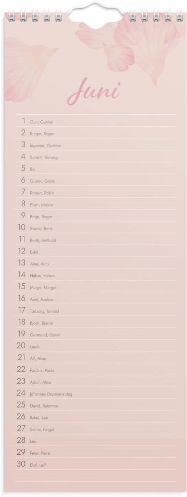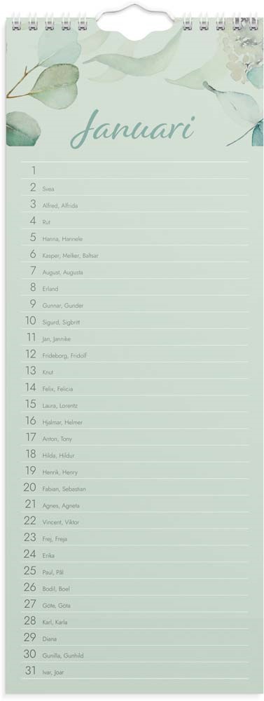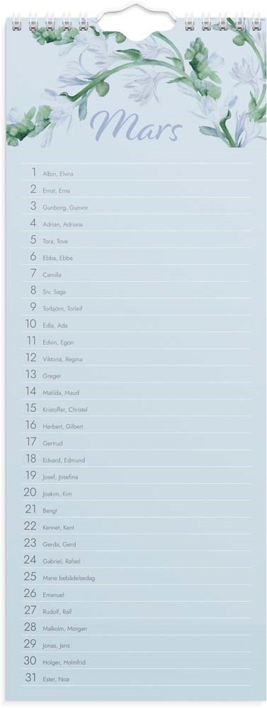 Format: 120x315 mm. Layout: Månad/blad. Spiralbunden. Innehåll: Namnsdagar. Antal sidor: 12. Pappersvikt: 170 g. Miljöinformation: FSC®. Varumärke: Burde.