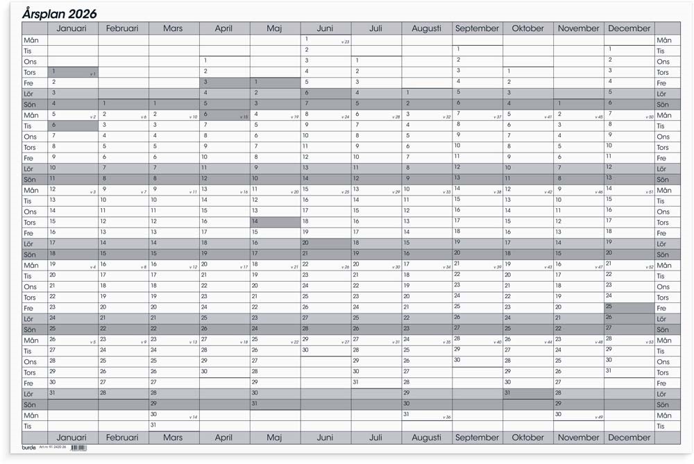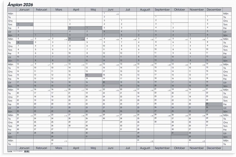 Kalender på whiteboard som levereras ihoprullad inklusive penna och fästnålar. Format: 890x590 mm. Layout: År/blad. Kalendarium: 2026-01-01 - 2026-12-31. Innehåll: Helgdagar, Årsplan/årsplaner. Antal sidor: 1.