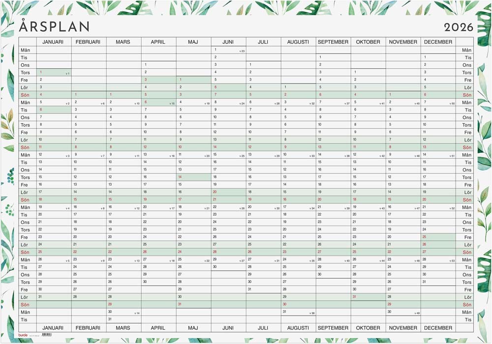 Kalender på whiteboard med mönstrad ram som levereras ihoprullad inklusive penna och fästnålar. Format: 995x695 mm. Layout: År/blad. Kalendarium: 2026-01-01 - 2026-12-31. Innehåll: Helgdagar, Årsplan/årsplaner. Antal sidor: 1.