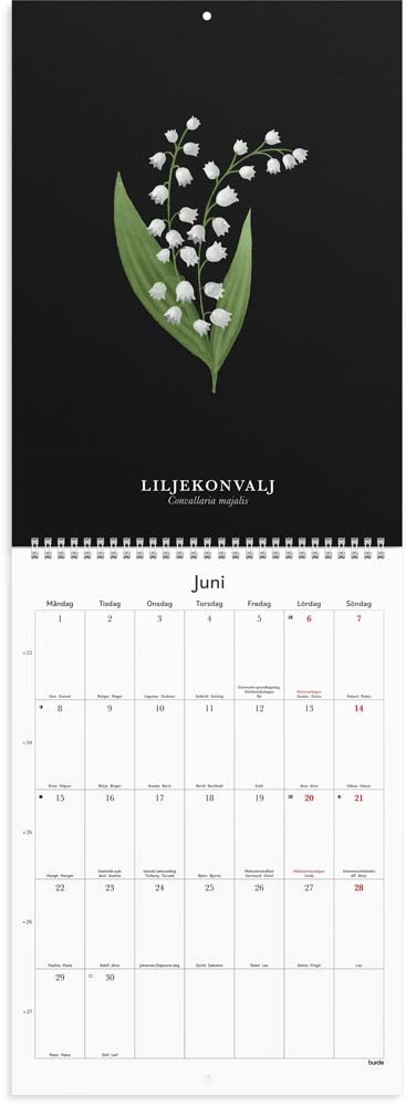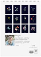 Väggkalender med illustrationer från naturen. Det vackert illustrerade motivet syns tydligt mot den svarta bakgrunden och blir som en tavla. I månadskalendariet finns möjlighet att anteckna.