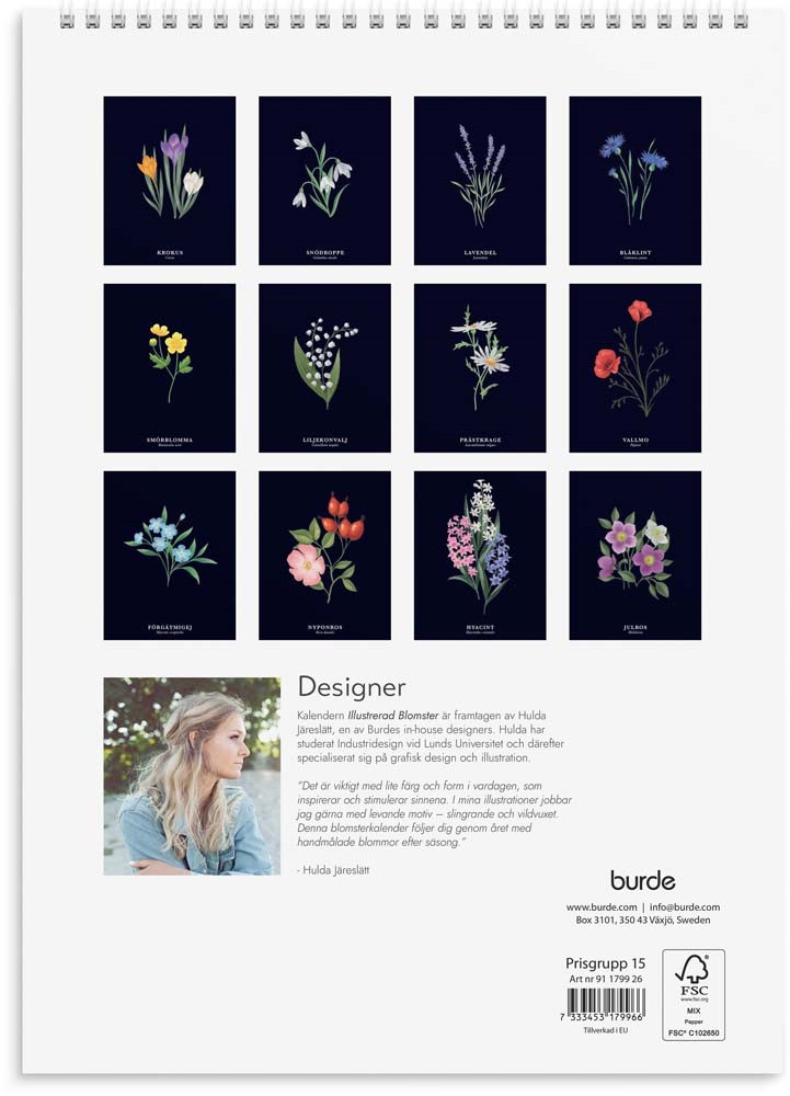 Format: A4. Layout: Månad/blad. Kalendarium: 2026-01-01 - 2026-12-31. Spiralbunden. Innehåll: Flaggdagar, Helgdagar/aftnar, Månfaser, Namnsdagar, Temadagar/händelser, Årsöversikt/årsöversikter. Antal sidor: 12. Miljöinformation: FSC®.