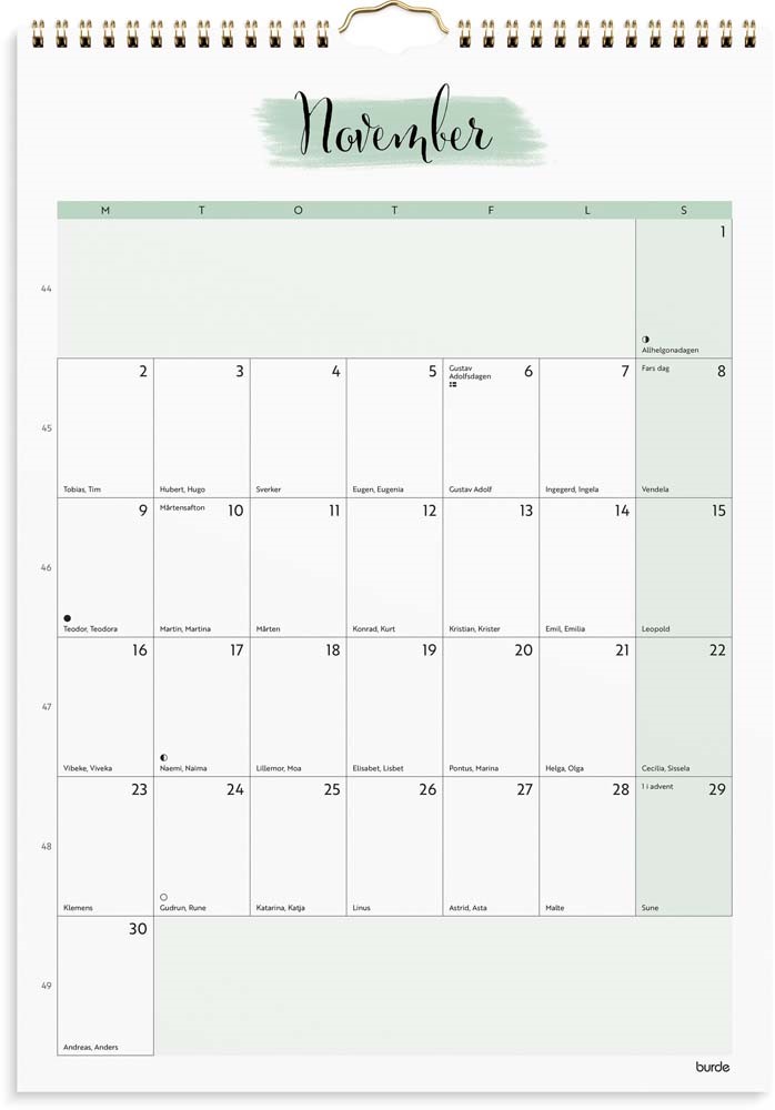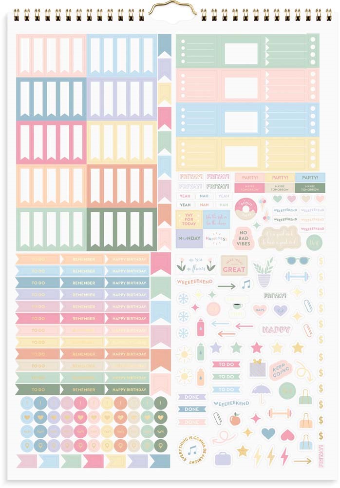 Väggkalender i A3-format med gott om plats att organisera och planera vardagslivet. Trendig layout och stilrena pastellfärger gör kalendern lättplacerad. Piffa med medföljande stickersark och skapa en personlig planering!