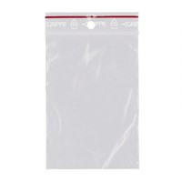 Blixtlåspåse T-08, 70x100mm (innermått) med 5mm runt hål för upphängning. 50 mikron, kraftig blixtlåsförslutning och röd linjemarkering. Livsmedelsgodkända. 100 påsar per bunt, 1000 påsar per förpackning.
