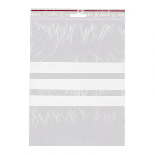 Blixtlåspåse T-75, 170x230mm (innermått) med 5mm eurohål för upphängning och tre skrivfält. 50 mikron, kraftig blixtlåsförslutning och röd linjemarkering. Livsmedelsgodkända. 100 påsar per bunt, 1000 påsar per förpackning.