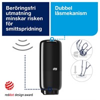 Den beröringsfria doseringen är enkel att förstå för personer i alla åldrar och den förbättrar hygienen genom att minska risken för korskontaminering. Den moderna Elevation-designen kommer dessutom att imponera på gästerna. Dispensern fungerar med en rad förslutna hudvårdsprodukter, som skumtvål och flytande tvål, samt med handdesinfektion i skum-, gel- och flytande form, för ökad flexibilitet. LED-påfyllningsindikatorn ökar effektiviteten och förenklar planeringen för personalen. Mått: 11,2x27,8x12,8 cm. Passar med Tork S4 refiller.