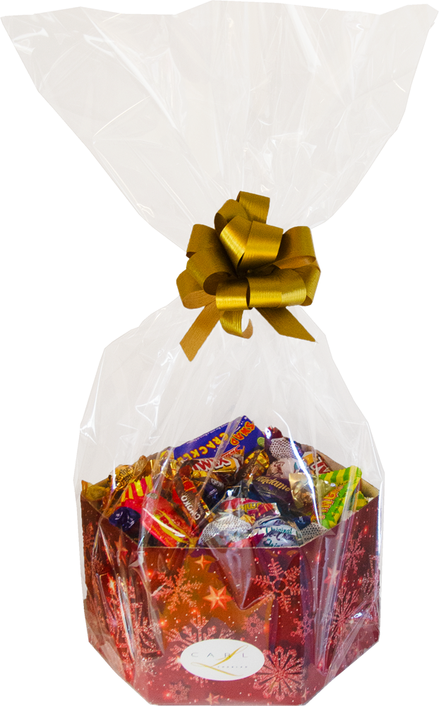 Mix av kolor och choklad snyggt förpackat med cellofan och rosett. Perfekt att ställa fram på julbordet.