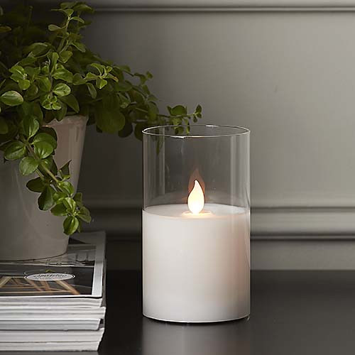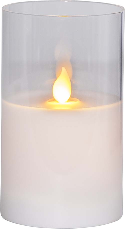 Glashållare med vaxljus där flamman lyser med ett naturligt varmt, gult sken. Timerfunktion. Drivs med 2 AA-batterier (ingår ej).