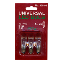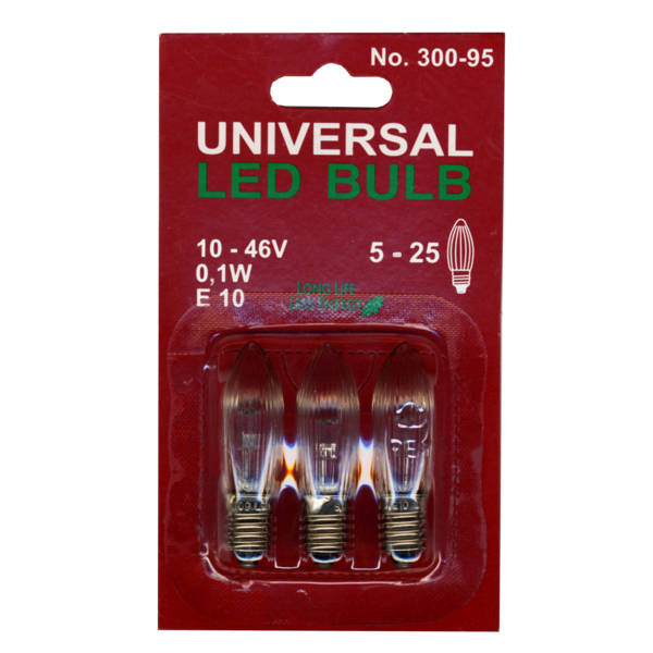 Universal LED Bulb reservlampa i 3-pack med E10 sockel, 10-55V. Denna produkt passar till ljusstakar med 4-25 lampor och stickkontakt.