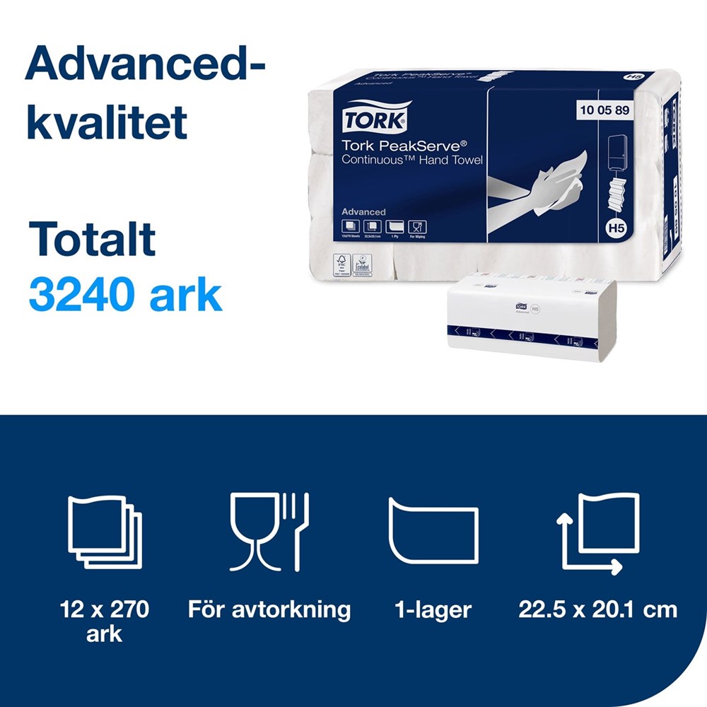 Systemet är kompatibelt med Tork PeakServe-dispensern. Det har en hög kapacitet på över 2100 handdukar som kan matas ut snabbt och utan avbrott för att behålla flödet. De komprimerade refillhanddukarna kan snabbt fyllas på när som helst, och de är dessutom enkla att förvara och transportera, så att personalen kan fokusera på rengöring.
