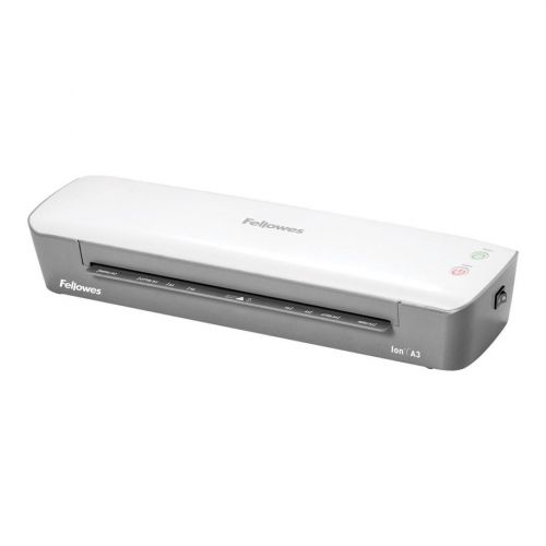 Fellowes lamineringsmaskin - Ion A3. En enkel lamineringsmaskin perfekt för hemmabruk och det lilla kontoret. Inkluderar startpaket med 10 lamineringsfickor samt rengöringsark. Värms upp på fyra minuter. Klarar storlekar upp till A3 (Photo Capable) och lamineringsfickor upp till 125 mikron. Handtag som gör att dokumentet kan släppas vid behov för justering. Släcks automatisk efter 30 min utan användning. För optimalt underhåll av din lamineringsmaskin rekommenderar vi användning av rengöringsark regelbundet.