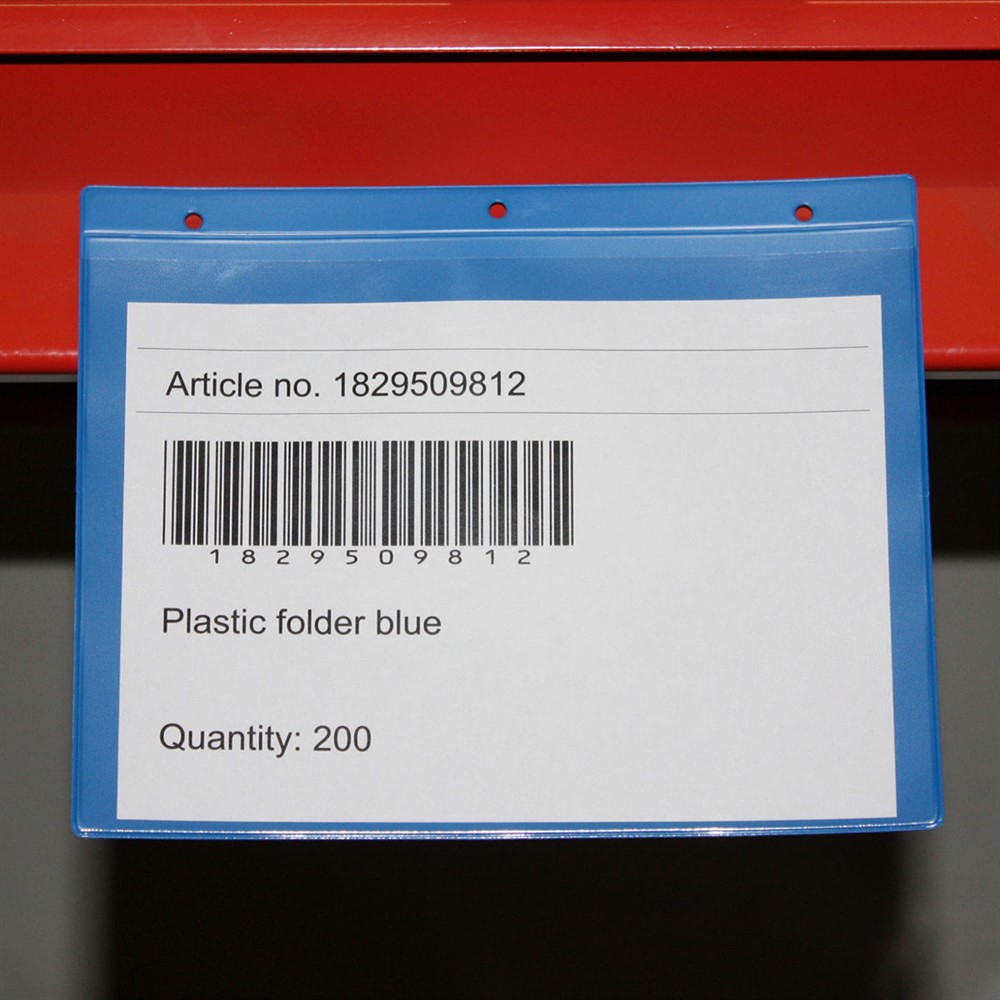 Ficka i hårdplast med genomskinlig plastficka på framsidan som skyddar etiketterna mot smuts och slitage. 3 hål i överkanten för upphängning. A5-format.