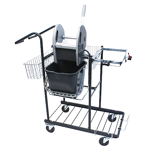 Bra budgetalternativ. Svabbpress och materialkorg i arbetshöjd. Lång korg på styret. 70-liters säckhållare. 2 st mopphängare. 2 platser för skaft och stativ. 100 mm kullagrade hjul. LxBxH (mm): 1040x540x1120.