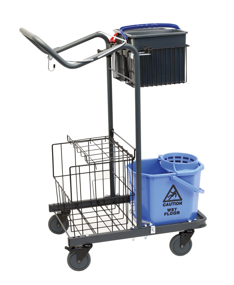 Liten och stabil vagn. Lättåtkomlig minisvabbutrustning. 6-litershinkar. Extra stor materialkorg. Plats för 2 skaft/stativ. Lättrullade 100 mm hjul.